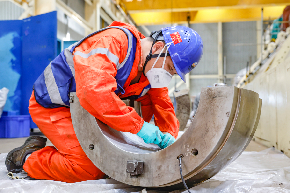 嘉電檢修人員手持“柳葉刀”進(jìn)行軸瓦修刮。 王侃 攝