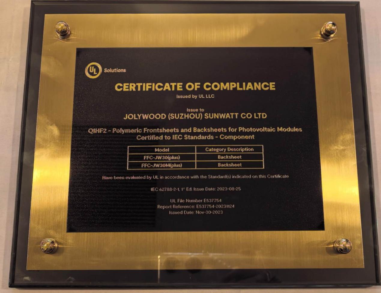 榮獲UL Solutions全球首張“光伏組件用背板IEC 62788-2-1認證證書。 中來股份 提供