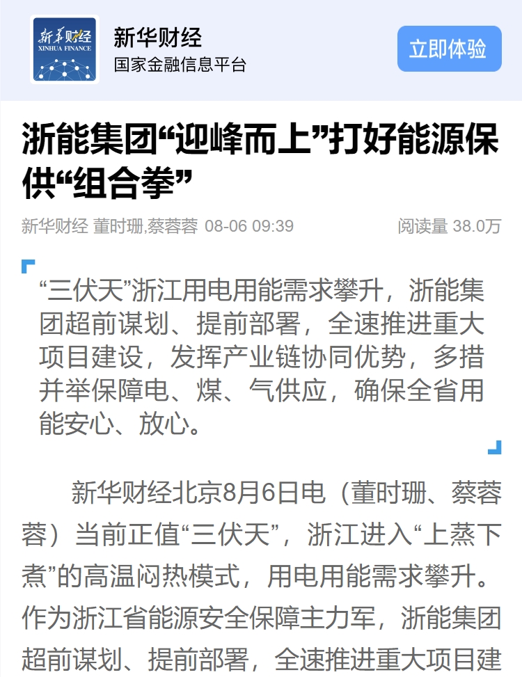 新華社客戶端、新華財(cái)經(jīng)客戶端報(bào)道《打好迎峰度夏“組合拳” 浙能集團(tuán)持續(xù)提升能源保供能力》。