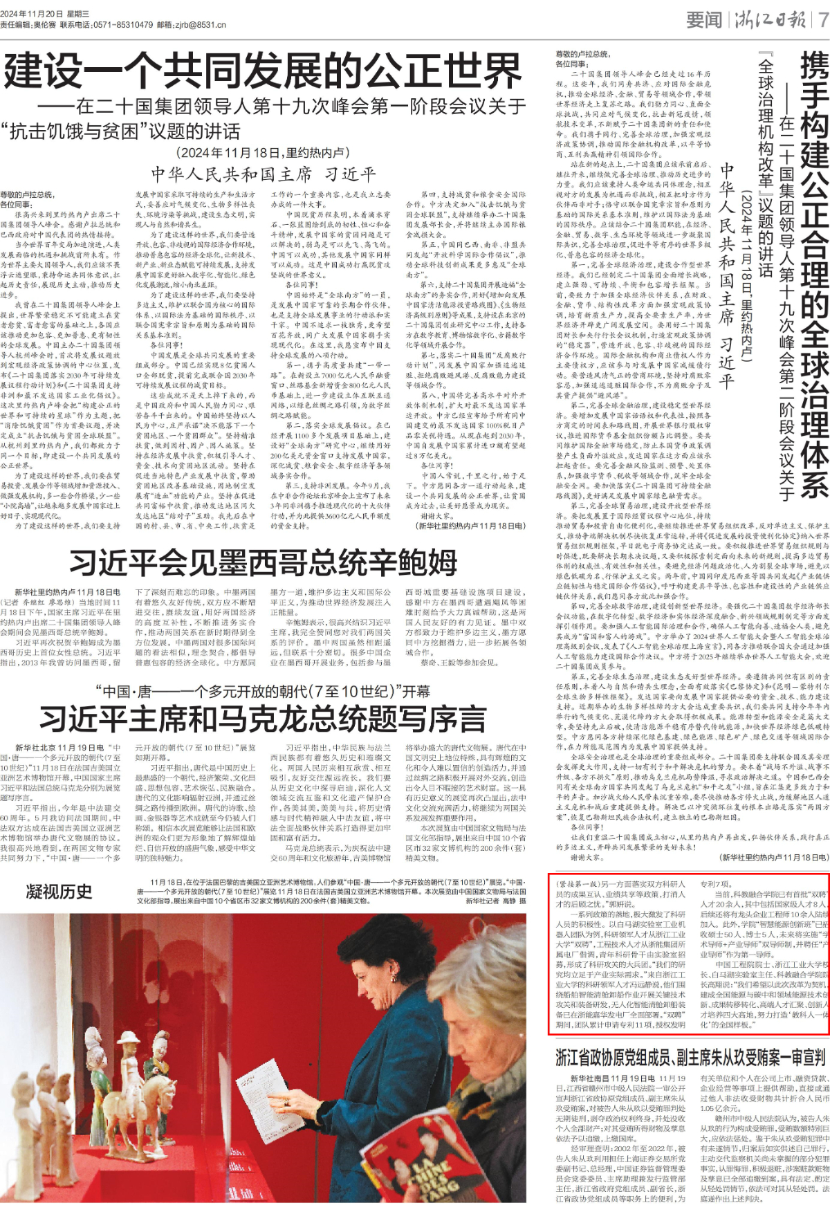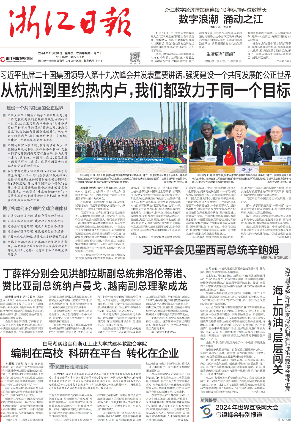 11月20日,《浙江日報》頭版聚焦白馬湖實驗室和浙江工業大學共建科教融合學院《編制在高校 科研在平臺 轉化在企業》。(下轉第七版)
