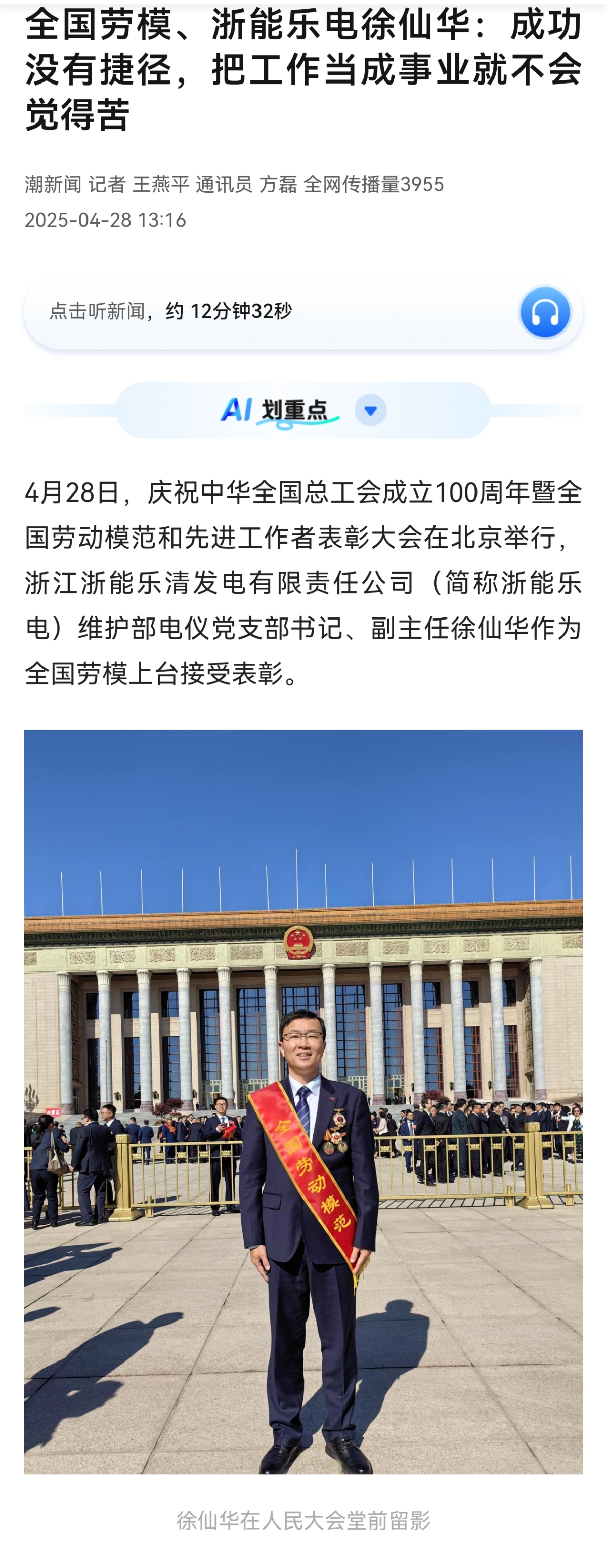 編者按:4月28日,慶祝中華全國總工會成立100周年暨全國勞動模范和先進(jìn)工作者表彰大會在北京舉行,浙能集團(tuán)所屬浙江浙能樂清發(fā)電有限責(zé)任公司維護(hù)部電儀黨支部書記、副主任徐仙華作為全國勞模接受表彰。新華社、浙江衛(wèi)視、錢江晚報(bào)、潮新聞、中國電力報(bào)、中國能源網(wǎng)等多平臺聚焦徐仙華同志多年扎根一線奮斗事跡。