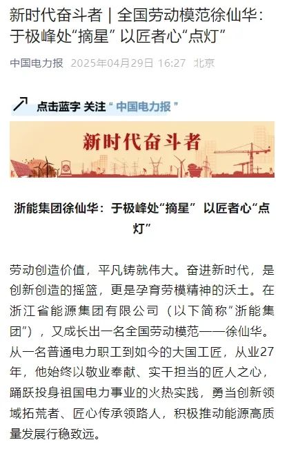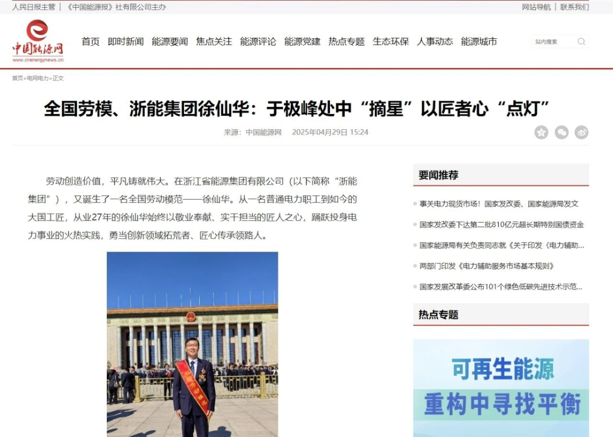 4月29日,人民日報(bào)旗下中國能源網(wǎng)報(bào)道《全國勞模、浙能集團(tuán)徐仙華:于極峰中“摘星” 以匠者心點(diǎn)燈》 中國能源網(wǎng) 攝