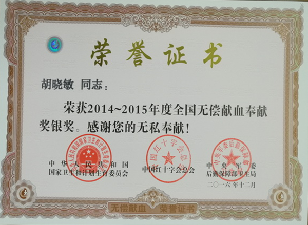 近日,溫州發(fā)電公司員工胡曉敏獲全國(guó)無(wú)償獻(xiàn)血奉獻(xiàn)銀獎(jiǎng),這是他第2次獲得“全國(guó)無(wú)償獻(xiàn)血奉獻(xiàn)銀獎(jiǎng)”殊榮,也是對(duì)他多年來(lái)長(zhǎng)期堅(jiān)持無(wú)償獻(xiàn)血,關(guān)心公益事業(yè)的肯定與褒獎(jiǎng)。
