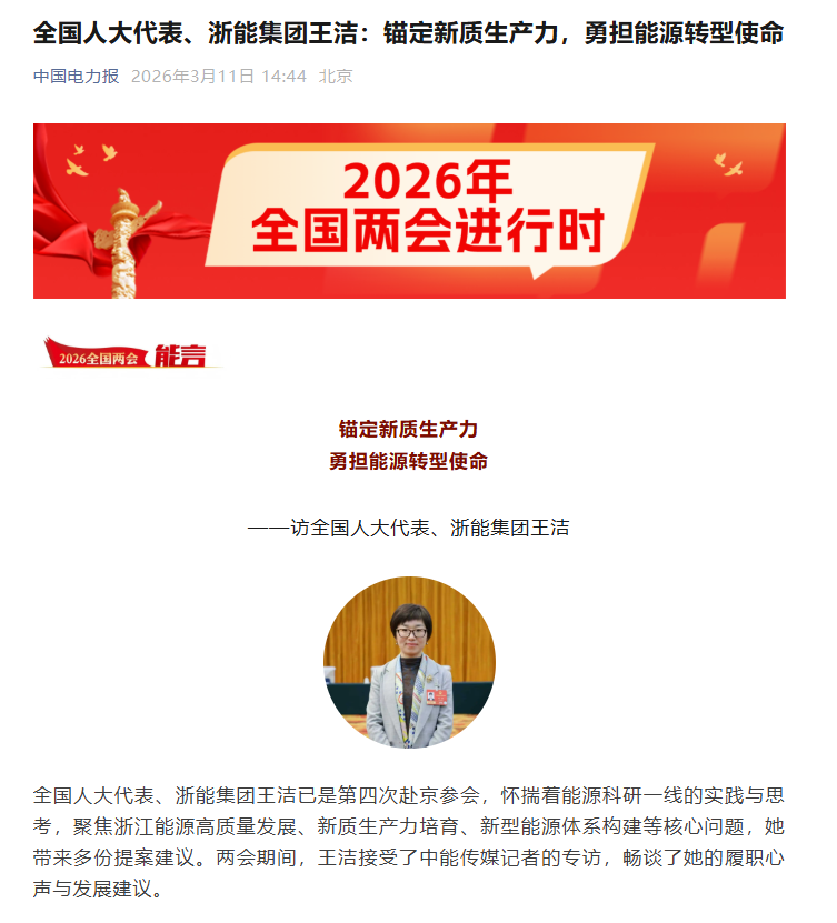 3月11日,“中國電力報”微信公眾號報道《全國人大代表、浙能集團王潔:錨定新質生產力,勇擔能源轉型使命》。 “中國電力報”微信公眾號 圖