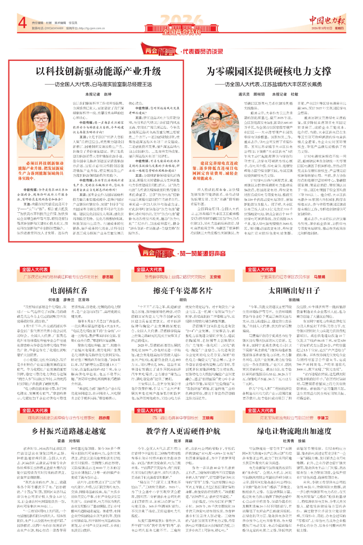 3月12日,《中國電力報》報道《以科技創新驅動能源產業升級——訪全國人大代表、白馬湖實驗室副總經理王潔》。 《中國電力報》 圖