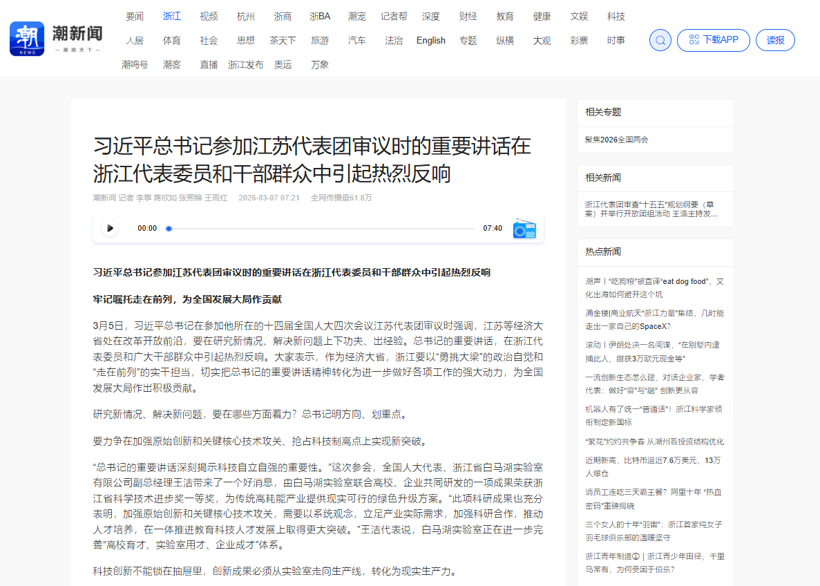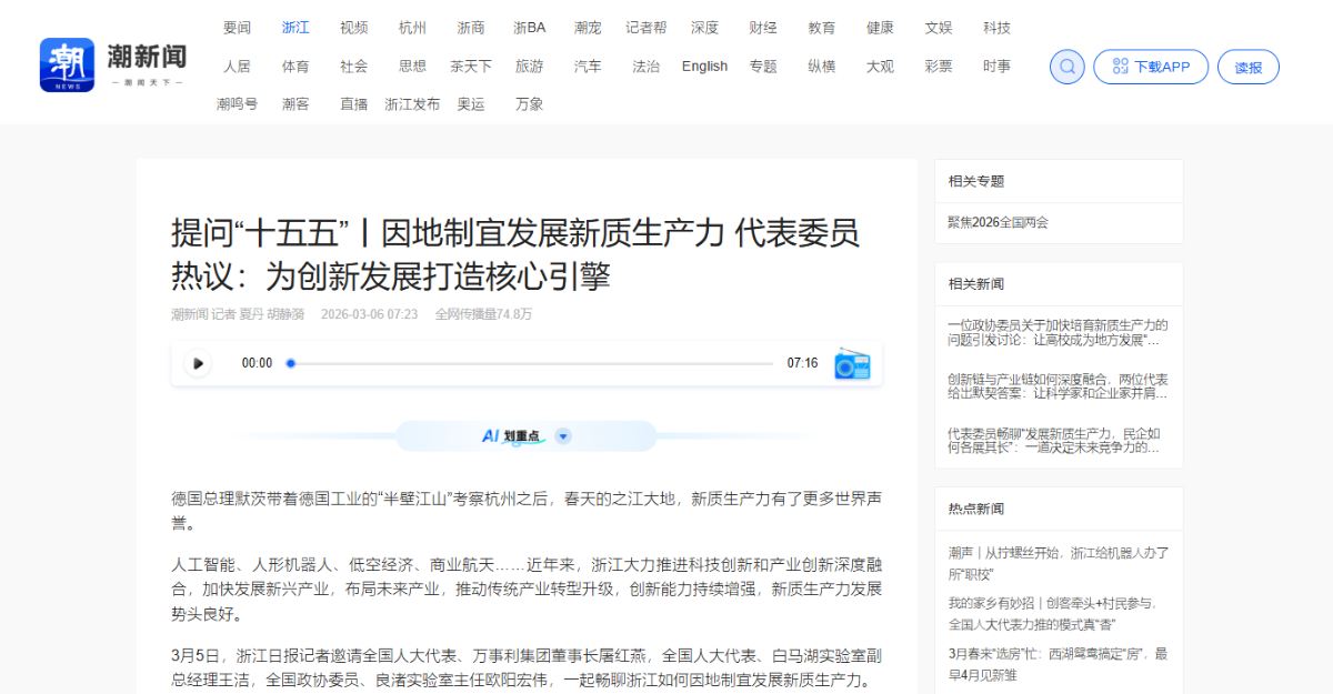 3月6日,《浙江日報》及潮新聞報道《因地制宜發展新質生產力,代表委員熱議——為創新發展打造核心引擎》。 《浙江日報》、潮新聞 圖