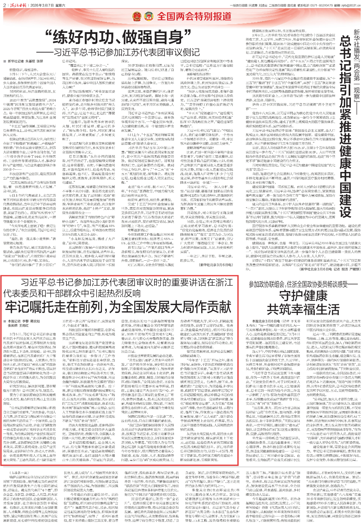 3月7日,《浙江日報》及潮新聞報道《習近平總書記參加江蘇代表團審議時的重要講話在浙江代表委員和干部群眾中引起熱烈反響——牢記囑托走在前列,為全國發展大局作貢獻》,采訪王潔同志。 《浙江日報》、潮新聞 圖