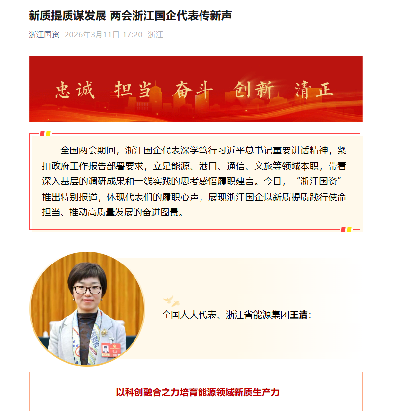 3月11日,“浙江國資”微信公眾號報道《新質提質謀發展 兩會浙江國企代表傳新聲》,就“以科創融合之力培育能源領域新質生產力”采訪王潔同志。 “浙江國資”微信公眾號 圖