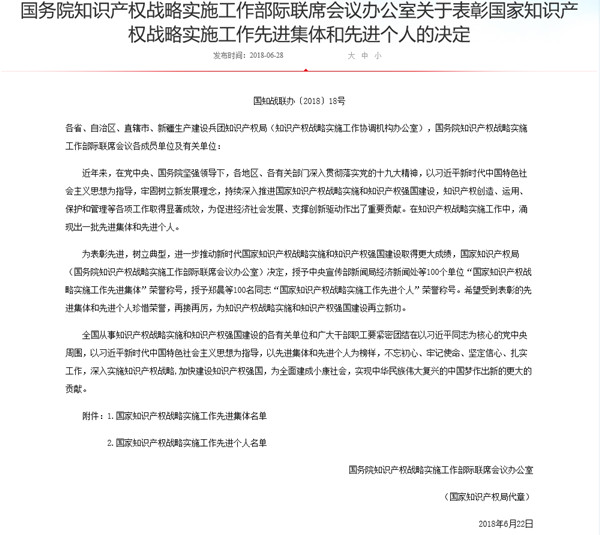此次評選表彰活動由國家知識產權局(國務院知識產權戰略實施工作部際聯席會議辦公室)組織,旨在表彰先進,樹立典型,進一步推動新時代國家知識產權戰略實施和知識產權強國建設取得更大成績,經過主管部門推薦,省里統一評審、上報,全國公示等層層篩選,最終評選出了包括中央宣傳部新聞局經濟新聞處在內的100個“國家知識產權戰略實施工作先進集體”單位,全省有4家先進集體獲獎。受到該次評選活動申報主體的限制,集團以戰略管理與法律部(集團知識產權戰略實施和知識產權法律保護的歸口管理部門)作為主體申報。榮譽稱號的獲得離不開省委省政府、省國資委、省知識產權局的大力支持以及集團各部門、系統各單位的長期堅持、不懈努力和成果積累。