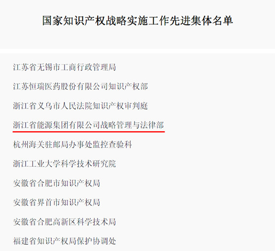 近日,從國家知識產權局(國務院知識產權戰略實施工作部際聯席會議辦公室)《關于表彰國家知識產權戰略實施工作先進集體和先進個人的決定》的文件獲悉,浙能集團戰略管理與法律部被授予“國家知識產權戰略實施工作先進集體”榮譽稱號。浙能集團也因此成為浙江省屬國企唯一獲獎單位。
