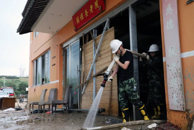 面對這一情況,浙能志愿者們立即投入緊張的救援工作中。他們接通周邊河水管路,開啟水泵對養(yǎng)老院外側(cè)道路以及內(nèi)部房間的泥沙進行沖洗。頂著烈日與刺鼻的異味,志愿者們絲毫沒有畏難情緒,全心投入到救援工作中。至傍晚18時許,在他們的不懈努力下,終于將養(yǎng)老院一樓泥沙清理完成,也成功恢復(fù)養(yǎng)老院通往外界道路的暢通。