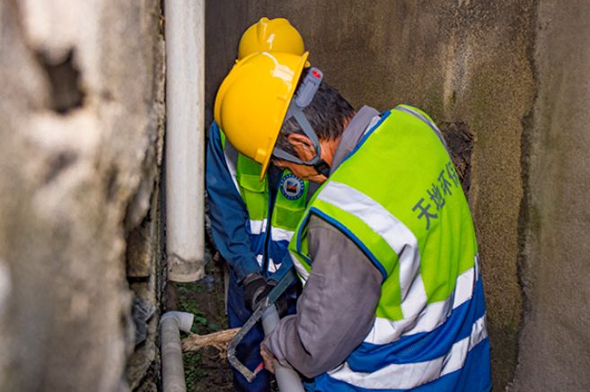 ▲浙能天地環(huán)保公司現(xiàn)場施工人員正在維修村民家污水排放管道。