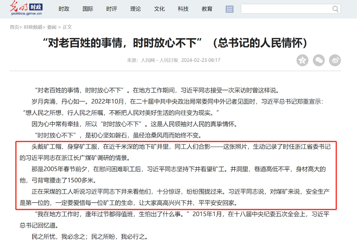 本網訊 2月23日,《人民日報》頭版頭條刊登《總書記的人民情懷|“對老百姓的事情,時時放心不下”》,光明網、求是網、中國新聞網、中國日報中文網、中國經濟網等多家央媒頭版轉載。“以時時放心不下的責任感、積極擔當作為的精氣神為黨和人民履好職、盡好責”,這是習近平總書記對廣大黨員、干部的殷切囑托,也是一個百年大黨走好新的趕考之路的底氣所在。 文中記錄了習近平總書記的調研故事,其中第一個講述的就是時任浙江省委書記習近平同志到長廣煤礦調研的故事。