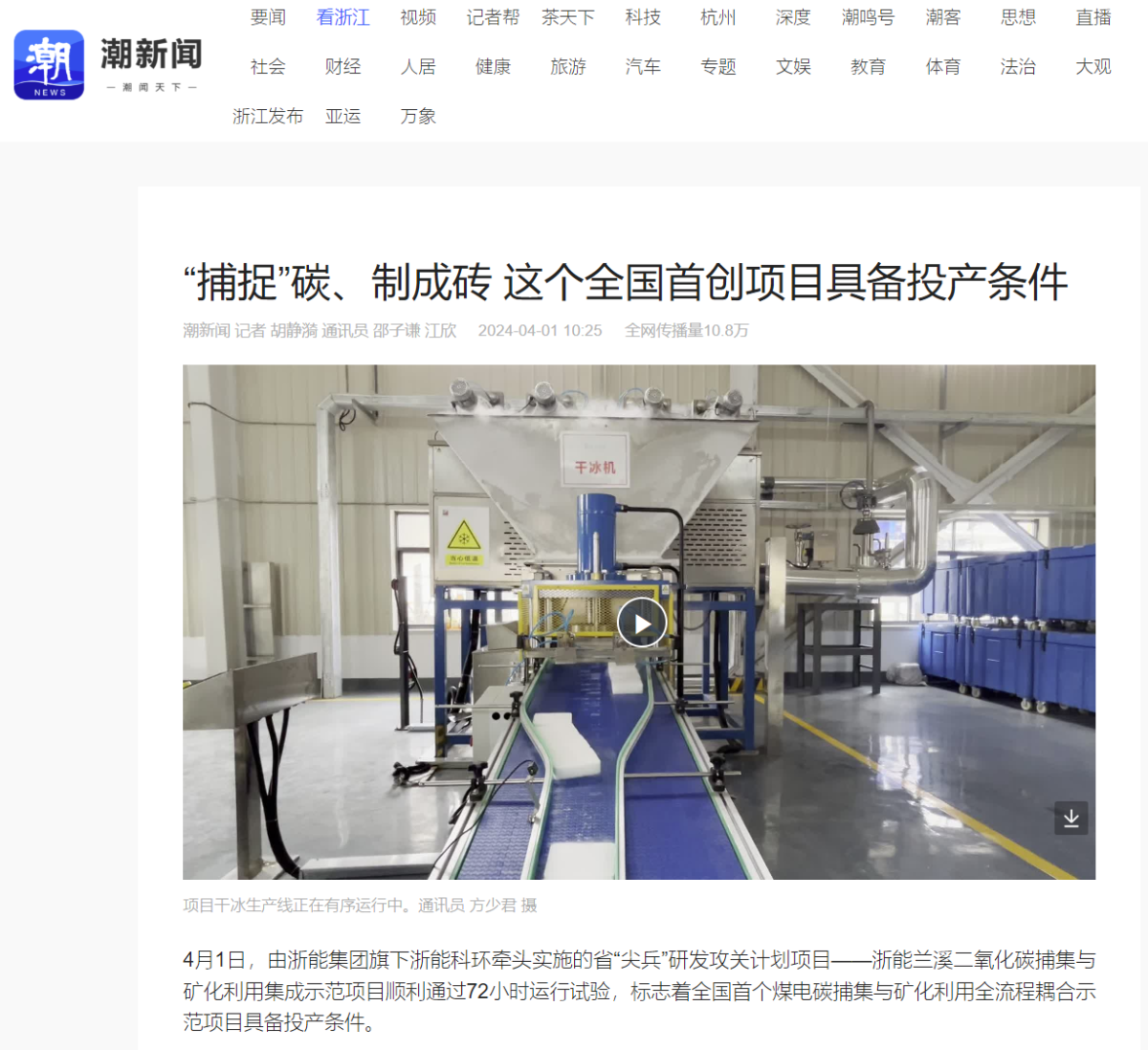 4月1日,浙報集團潮新聞客戶端報道《“捕捉”碳、制成磚 這個全國首創項目具備投產條件》。 潮新聞客戶端 圖