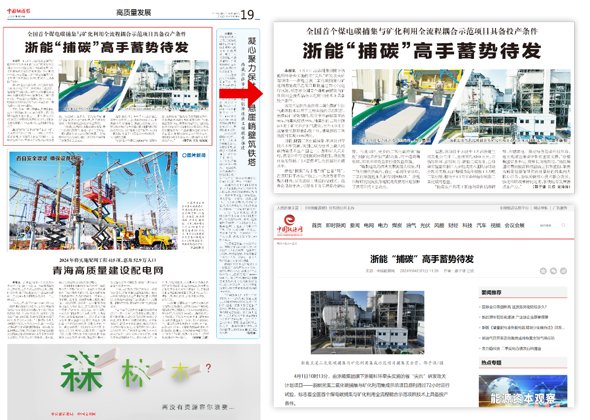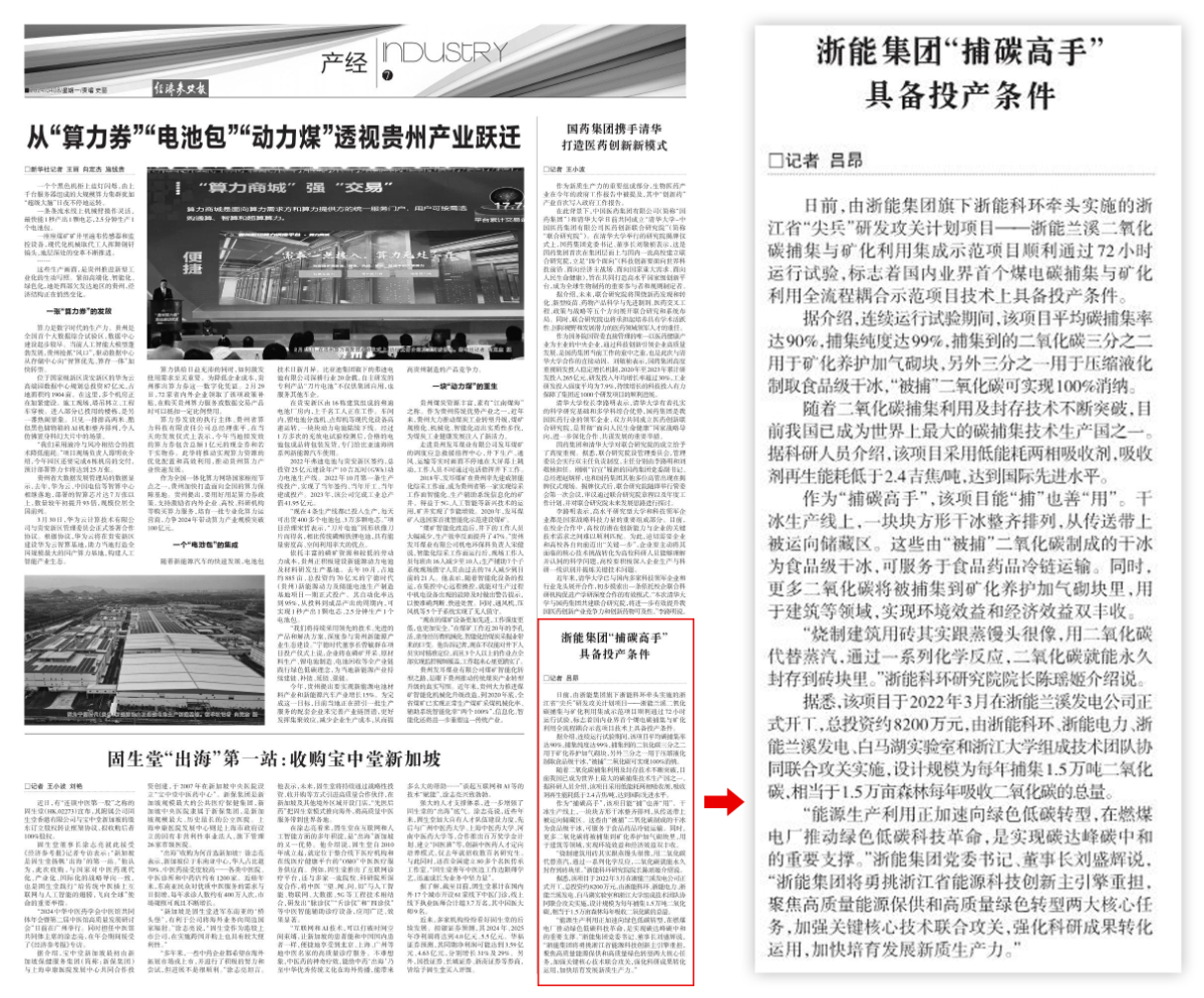 4月8日,新華社主管主辦經濟參考報報道《浙能集團“捕碳高手”具備投產條件》。 經濟參考報 圖