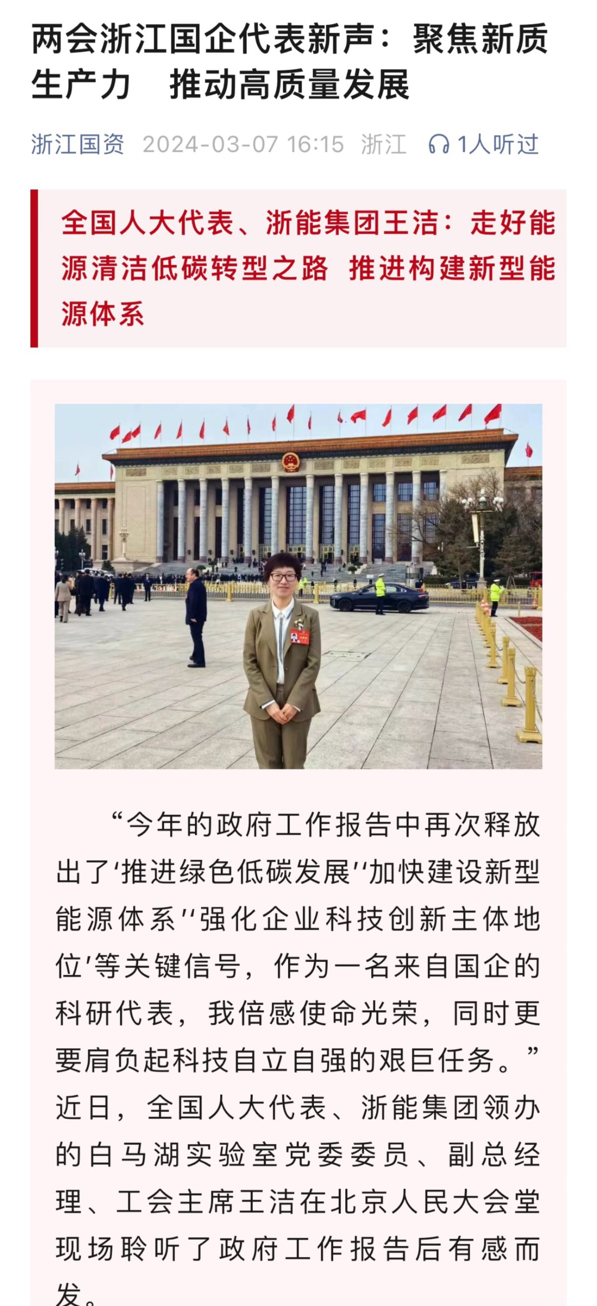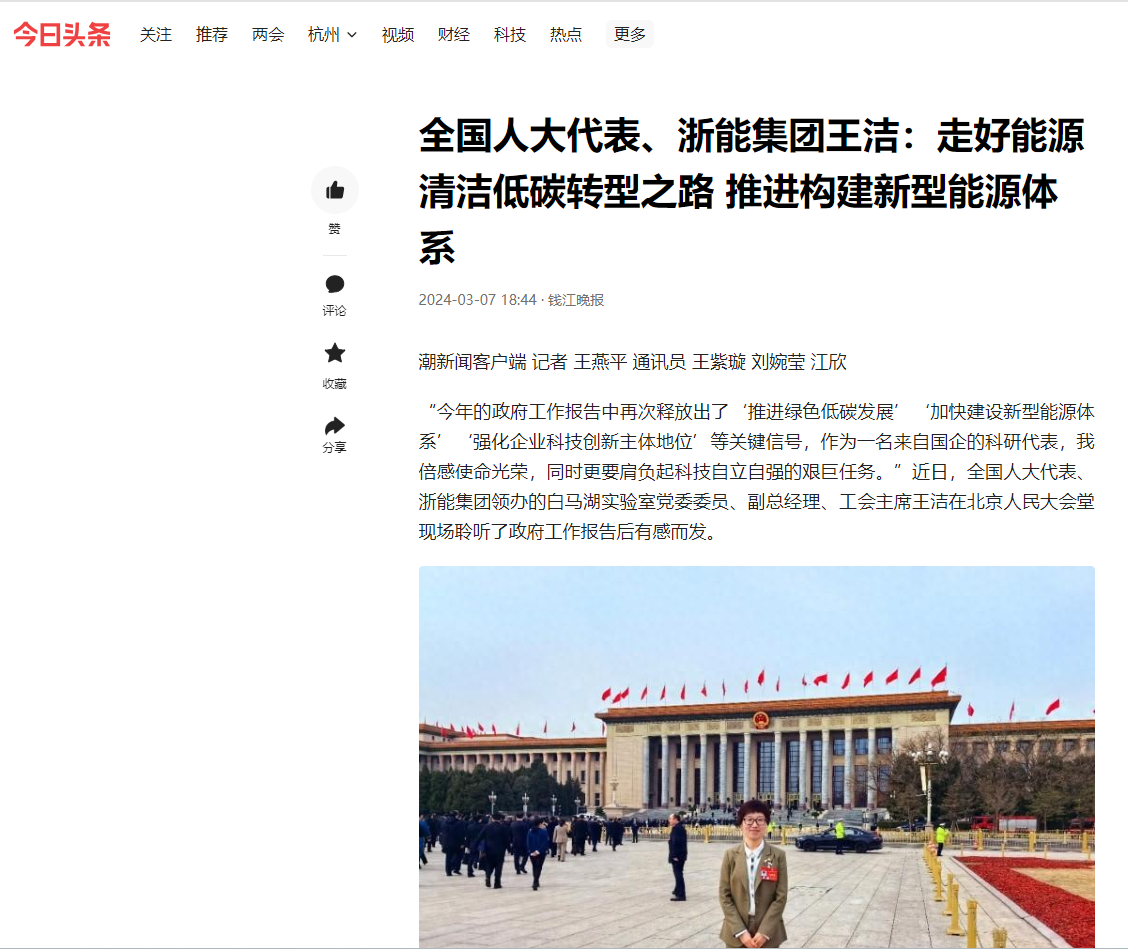 今日頭條報道《全國人大代表、浙能集團王潔:走好能源清潔低碳轉型之路 推進構建新型能源體系》。 今日頭條 圖