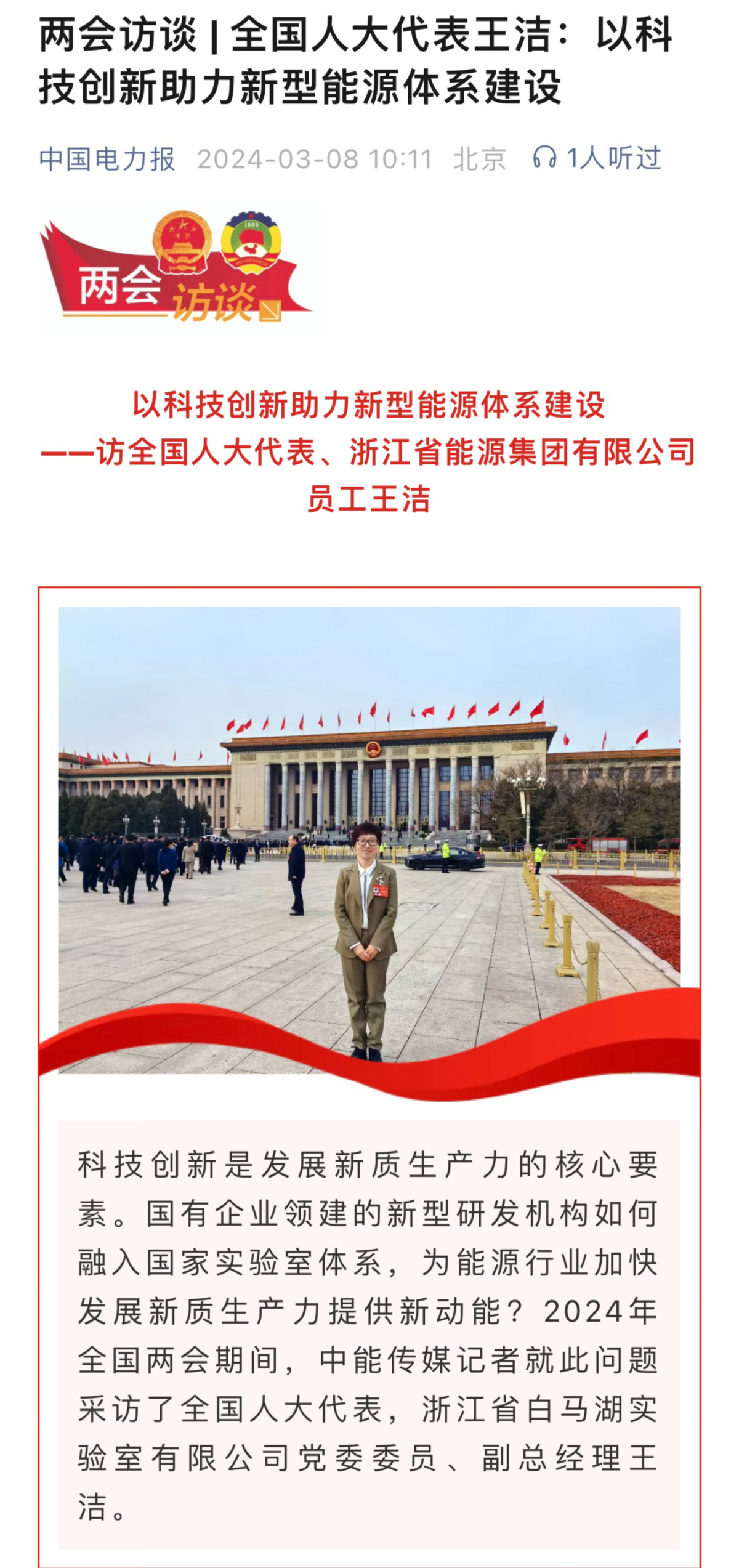 中國電力報報道《兩會訪談 | 全國人大代表王潔:以科技創新助力新型能源體系建設》。 中國電力報 圖