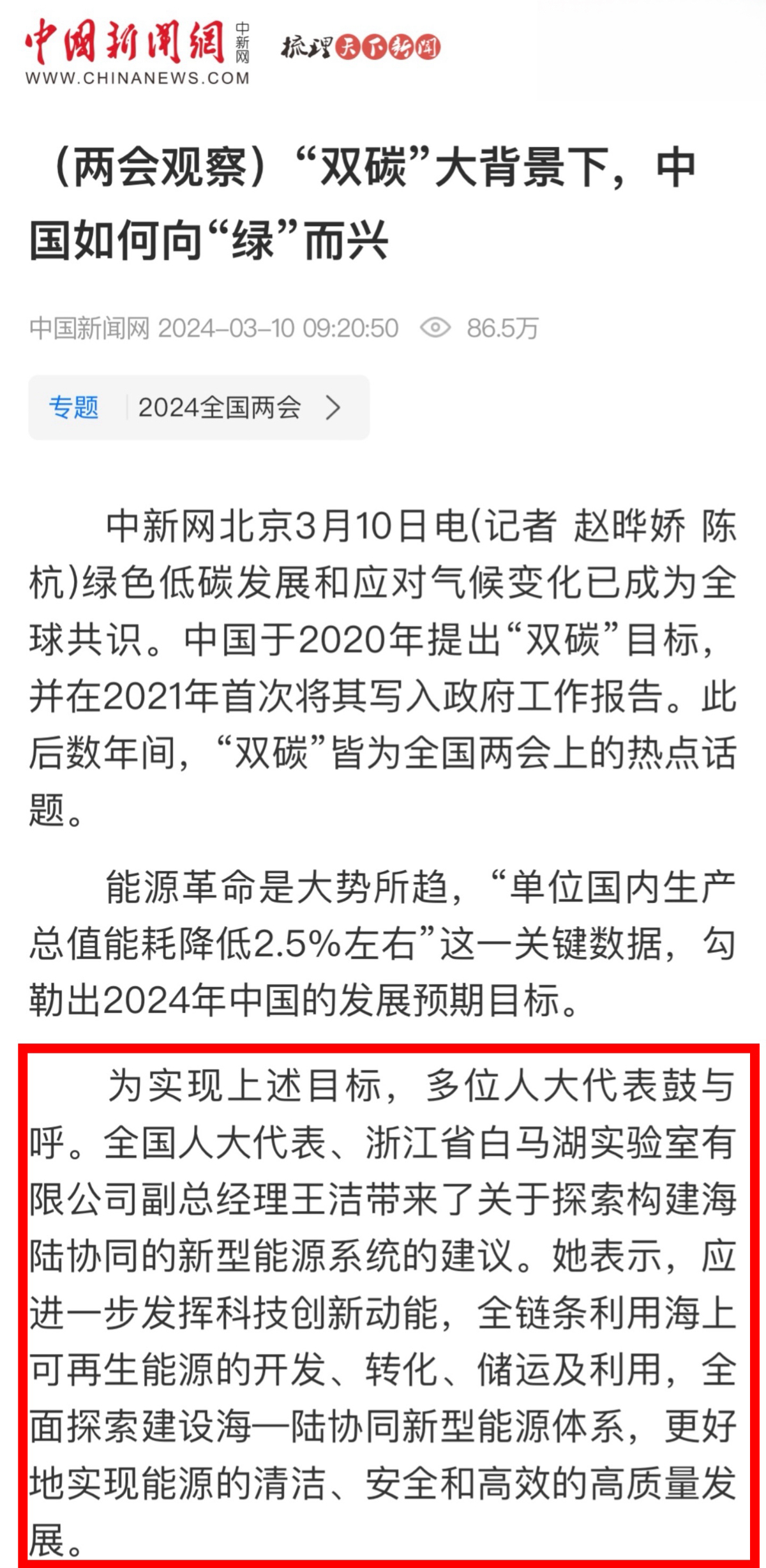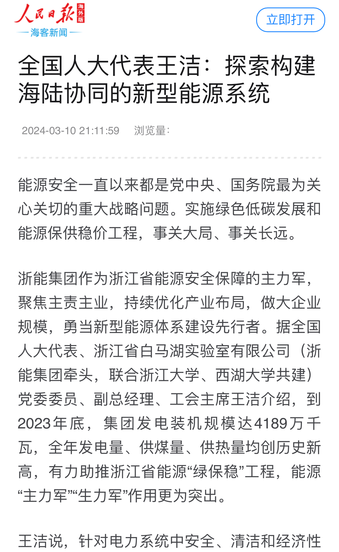 潮新聞客戶端報道《全國人大代表、浙能集團王潔:走好能源清潔低碳轉型之路 推進構建新型能源體系》。 潮新聞客戶端 圖